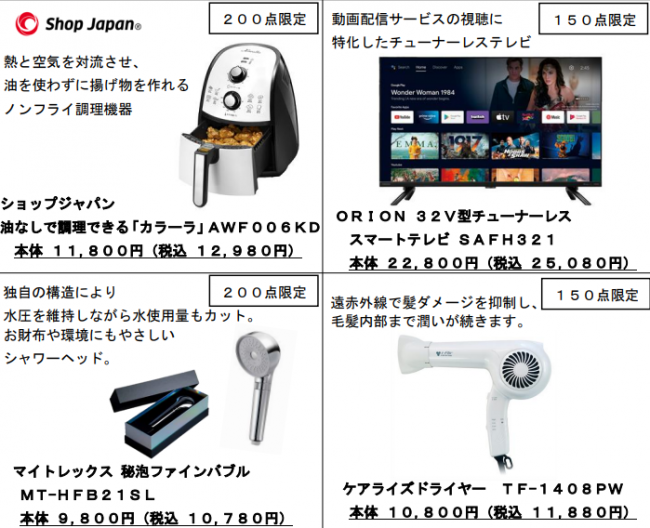 セール対象商品の一例として、ノンフライ調理機器やスマートテレビ、シャワーヘッド、ドライヤー などを数量限定で販売する。Z世代からミレニアム世代の20~30代向けの商品を提案している。