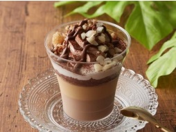 チョコプリン、マカデミアナッツムース、チョコホイップ、マカデミアナッツがトッピングされた層のきれいなパフェ。夏でも食べやすいナッツテイスト。本体価格288円(以下同じ)。
