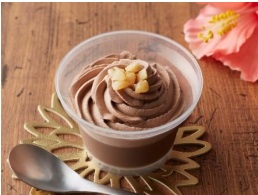 マカデミアナッツの風味が豊かなチョコプリンと、チョコホイップを合わせ、マカデミアナッツをトッピングした。260円。
