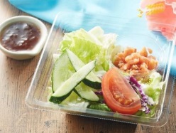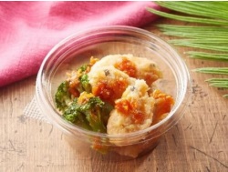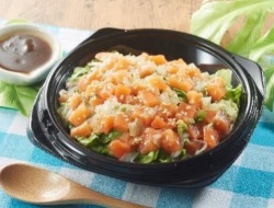 サーモンをトッピングしたポキをイメ―ジした。玉ねぎ、生姜、にんにくを炒めた醤油ベースに、オイスターエキスで旨味とコクをプラスしたポキソースを添付した。398円。