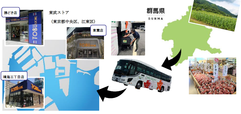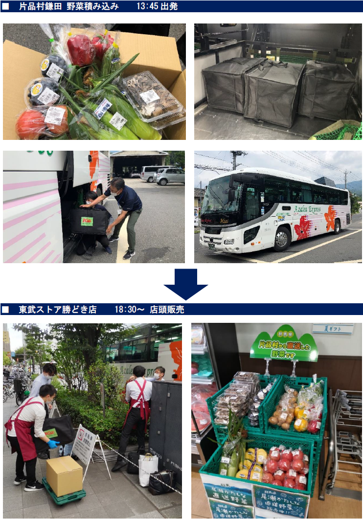 この取り組みでは、片品村の農家の人々が生産した朝採れの高原野菜(糖度の高いとうもろこしやトマトなど)を「道の駅 尾瀬かたしな」で集荷し、関越交通の高速バス尾瀬号に積み込んで運行、終点のバスタ新宿から車庫へ回送する際に東武ストア「勝どき店」「東雲店」「晴海三丁目店」のいずれか 1 店舗へ配送する。