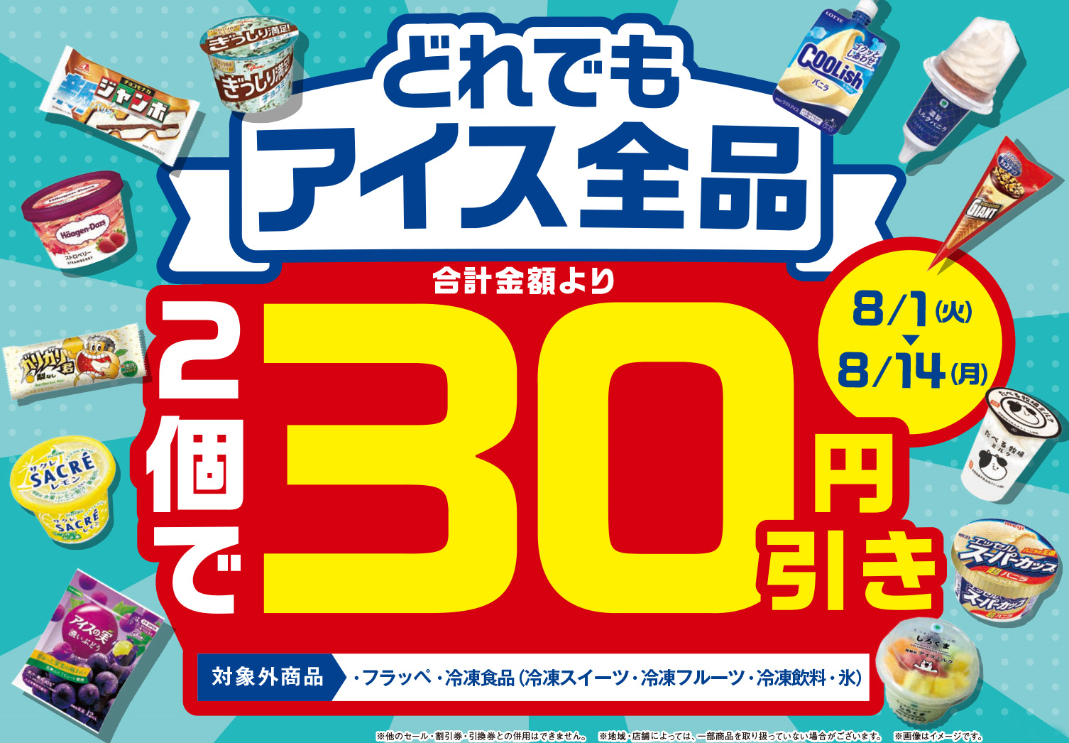 気象庁の発表によると、今年の8月の気温は全国的に平年よりも高くなり、厳しい暑さになると予想される。そこで、ファミリーマートでは、お客に少しでも暑い夏を快適に過ごしてもらえるように、アイスをどれでも2個買うと、合計金額から30円引きとなるおトクなキャンペーンを実施する。