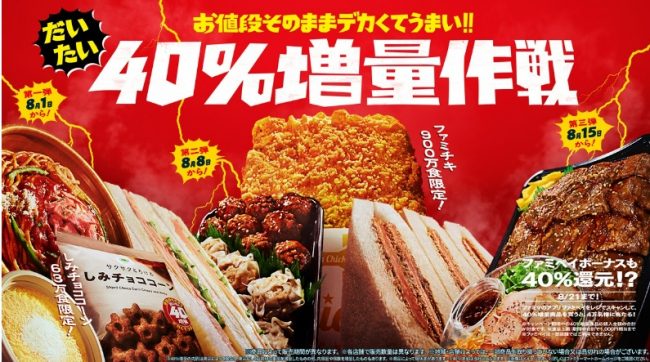 ファミマnews|週替わりで16商品「お値段そのまま!!40%増量作戦」8/1から