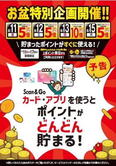 Scan&Goカードは、6月1日(木)から全店での配布を開始していた。好評につき、8月も、「1カ月間ず~っと!お得にポイントが貯まる」企画を開催している。さらに、8月11日(金)から17日(木)は Scan&Goカードと Scan&Go ignicaアプリのお盆特別企画を開催する。