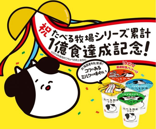 今回のキャンペーンでは、まず、1億食突破記念限定パッケージとして4種を展開する。また、定番スイーツと「たべる牧場ミルク」とのコラボレーション商品として、「たべる牧場スフレプリン」323円(税抜き、以下同じ)、「たべる牧場みるくシュー」165円を発売する。