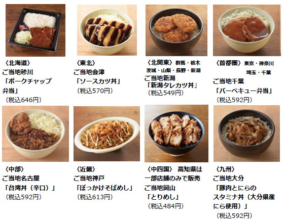 2021年11月には全国7エリアのご当地丼をエリアごとに発売した。その時の発売1カ月の売上高は、1位が北関東甲信越エリア「ご当地桐生 ソースかつ丼」、2位が東北エリア「ご当地会津 ソースカツ丼」、3位が中部エリア「ご当地岐阜 鶏ちゃん丼」だった。