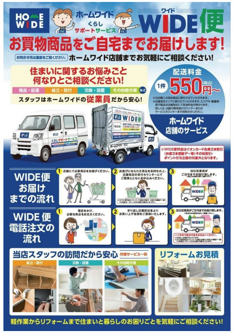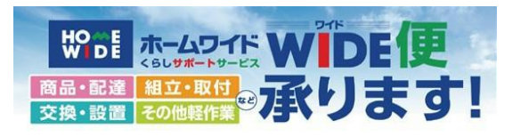 「WIDE便」は、購入商品の自宅配送から、シーリングライトの交換、大型家電の設置、家具組み立て、網戸交換、パンク自転車の引き取り修理、小型収納庫の組み立て、園芸肥料・用土・砂利の大量配送、デジタルカタログからのリフォーム相談・施工などのサービスを実施している。ホームワイドでは、約200人の従業員がDIYアドバイザーやグリーンアドバイザーなどの専門資格を持っていて、このサービスに対応する。