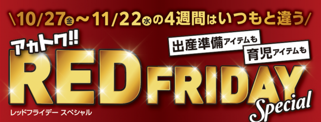 レッドフライデーは、「バイヤーの『赤く』燃えるような気持ちを厳選アイテムに込めた、『赤ちゃんとファミリー』のためのセール」を意味する。出産準備用品や育児用品などを特別価格で提供する。