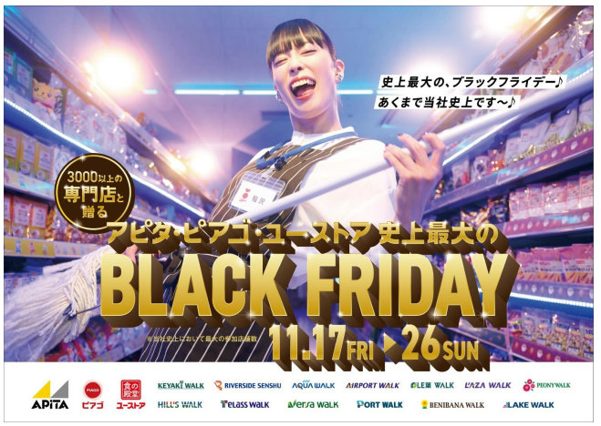 ユニー(株)(愛知県稲沢市、榊原健社長)は11月17日(金)から26日(日)までの10日間、アピタ・ピアゴ・ユーストアと3000以上の専門店が参加する最大の店舗数で「ブラックフライデー」を開催する。