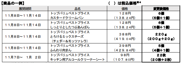 増量対象となる商品は利用頻度の高い「パン」「ミックスチーズ」「キッチン用アルコールクリーナーシート」など17品目。日用品を除き、1週間の期間限定で増量商品を販売する。