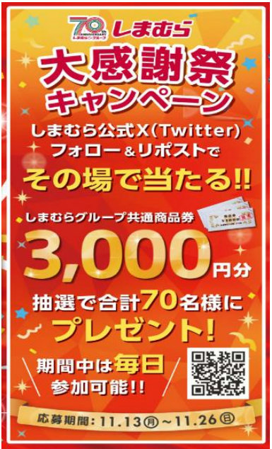 また11月13日(月)~11月26日(日)の期間中、「しまむら70周年」を記念したキャンペーンを実施する。公式X(Twitter)をフォローし、リポストすると、その場でしまむらグループ共通の商品券3000円分が抽選で70名に当たる。期間中は毎日、参加が可能だ。