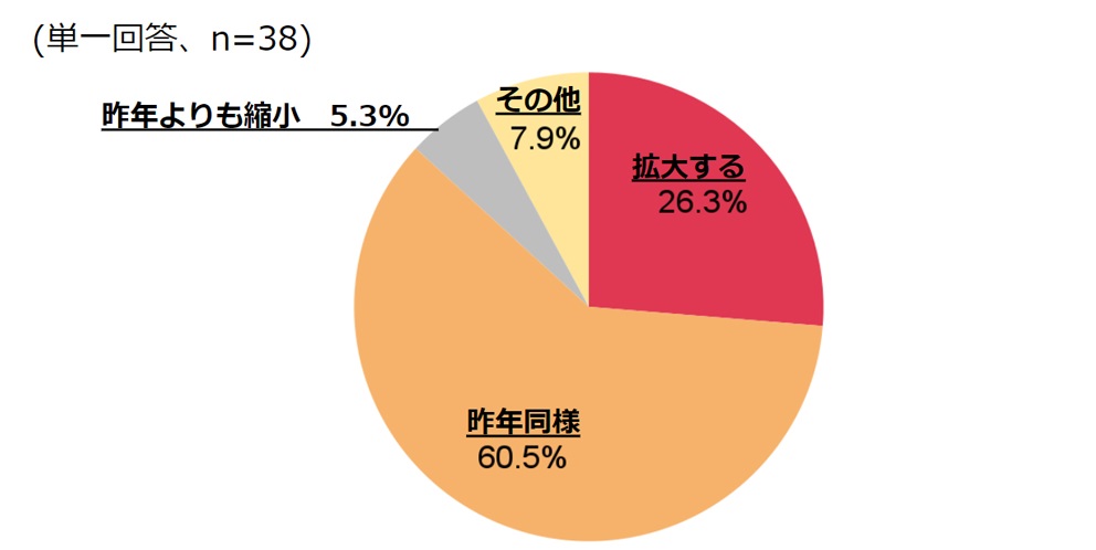 また、販促施策を「実施する」と回答した企業に、昨年よりも規模を拡大する予定か聞いたところ、「拡大する」26.3%、「昨年同様」60.5%、と合わせて80%以上の企業が昨年と同等かそれ以上の規模のセールやイベントを計画している。