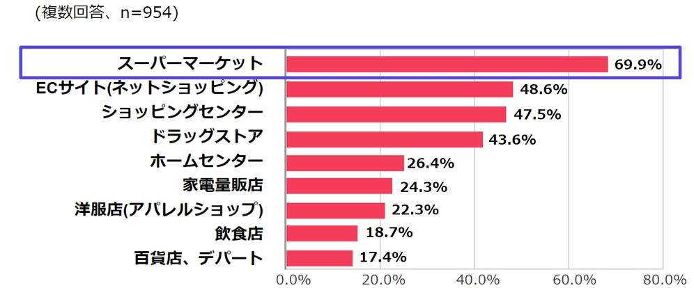 「ブラックフライデー」のセールで「買物をしたい」と回答した人に、買物をしたい場所を聞いたところ、第1位は「スーパーマーケット」69.9%。購入したい商品やサービスについては、「食料品・飲料品」が約8割で最多となり、次いで「日用品」60.7%、「衣料品」53.2%となった。