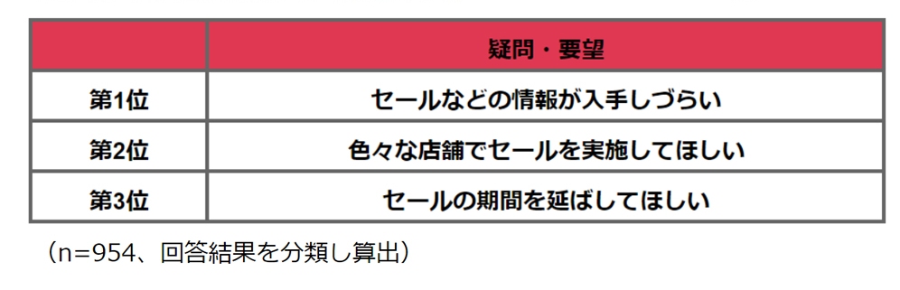 「ブラックフライデー」のセールで「買物をしたい」と回答した人に「ブラックフライデー」に関する疑問、要望について聞いた。「セールなどの情報が入手しづらい」という意見が最も多く、次いで「いろいろな店舗でセールを実施してほしい」という意見だった。