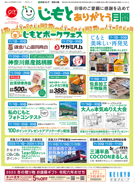 (株)京急ストア(神奈川県横浜市、青野良生社長)は今年6月に創立90周年を迎えた。1933年6月に創立した。京急ストアでは運営する京急ストア・もとまちユニオンで「京急ストア創立90周年」記念として11月を「じもとありがとう月間」と定めてセールやイベントを実施している。