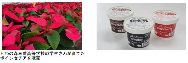 販売商品の一例は、ポインセチアが中サイズ一鉢で本体価格2000円(12月2日限定販売)、100mlの酪農アイスがバニラ、ストロベリー、チョコの3種類で各250円など。