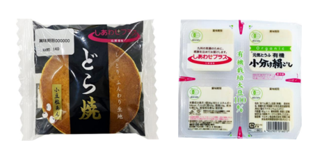 「あわしま堂 どら焼」は本体価格98円(以下同)、「マルキン食品 有機小分け絹ごしとうふ」は80g×4個入りで98円。