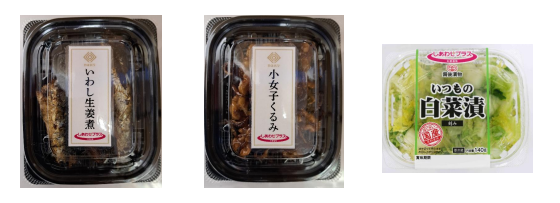 「カネハツ食品 いわし生姜煮」は50gで198円、「カネハツ食品 小女子くるみ」は40gで198円、「備後漬物 いつもの白菜漬 」は140gで138円。