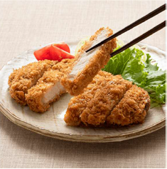 低温で熟成させることで、やわらかくて旨味成分がたっぷりと詰まった肉質の「熟成うまリッチポーク」をロースカツにした。塩職人が丹精を込めてつくり上げた海水と海藻の旨みが凝縮された淡路島の藻塩で下味をつけ、衣にもこだわった。製造時直前に粉砕した2種類の生パン粉をまぶし、店内で揚げることでサクサクとした⾷感に仕上げた。価格は1枚429円、2枚850円。