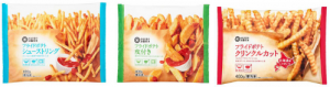 左からフライドポテト シューストリング(冷凍)、フライドポテト 皮付き(冷凍)、フライドポテト クリンクルカット(冷凍)。価格は400g入りで298円。