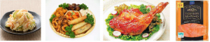 左から「食の幸 野菜のうま味が深いポテトサラダ」(299円)、「オードブル」(1580円)、「国産森林どりのローストチキンもも」(1本699円)、「食の幸 フィヨルドトラウトスモークサーモン」(399円)。