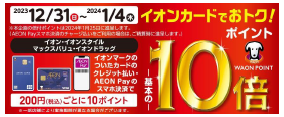 対象店舗において、イオンマークのついたクレジットカードを利用すると、通常200円につき1ポイントのところ10倍の10ポイントが付与される。