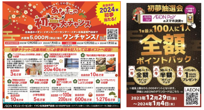 その他、様々な初夢が抽選で叶う「あなたの初夢大チャンス」では「10万円(税込)分お買物し放題!」や、12月29日(金)~2024年1月4日(木)までの期間限定で、AEON Payのスマホ決済で、全額ポイントバックが抽選で当たるキャンペーンなど、初売りにあわせて各種お楽しみ企画も実施する。