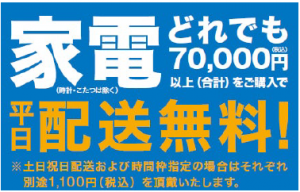 期間中に店舗で家電を7万円(税込み、以下同じ)以上購⼊すると、平⽇配送料⾦最⼤4950円が無料となる。ただし、⼟⽇祝⽇配送および時間枠指定の場合はそれぞれ別途1100円がかかる。ニトリネットで購⼊する場合、配送料⾦最⼤4950円分のメンバーズ・アプリ会員ポイントが翌⽉末までに付与される。