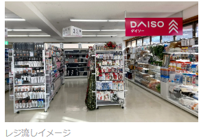 また、スーパーマーケット、ホームセンターなど商業施設の一角にDAISOを導入することで集客を高めることができる「レジ流し」という出店形態の導入事例や成果などを解説する。「レジ流し」とは、スーパーマーケット、ホームセンターの更なる集客向上を目的に、店舗の一角にDAISOを導入する出店方法。DAISOブランド、商品をラインナップに加えることによる集客効果・新規顧客の獲得、DAISO商品の購入による、購入点数の向上、余剰スぺースの有効活用などさまざまなメリットを期待できる。