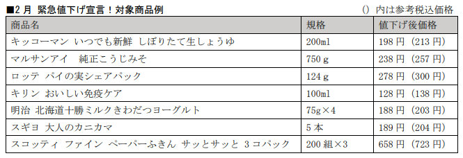 2月は、バレンタイン菓子やラーメン、免疫ケア食品、旬を迎える新物の三陸産わかめなど、利用頻度が高い食料品・生活用品を中心に221品目を選定して、最大40%値下げする。