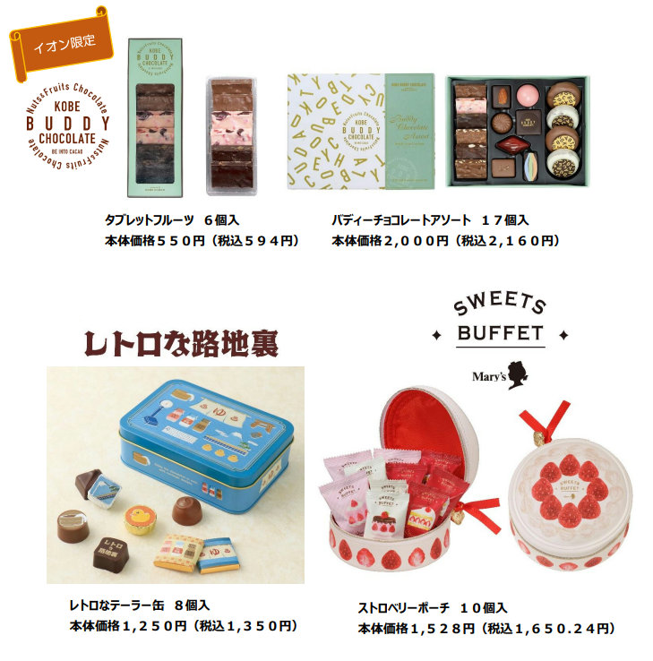 イオン限定品として、Cacao本来の風味や味わいを大切に、こだわりのナッツやレモン・伊予柑・ストロベリーなどあらゆる素材とのマリアージュから無限にひろがるチョコレートの魅力を探求する「KOBEBUDDY CHOLATE」の「タブレットチョコレート」やベルギー直輸送のチョコレート「フランドール」、昨年も好評だったレトロ喫茶をモチーフにしたノスタルジックな世界観がかわいい「はじけるキャンディーチョコレート」や、まるでいちごケーキのようなときめくパッケージが魅力の「スイーツビュッフェ」などが品揃える。