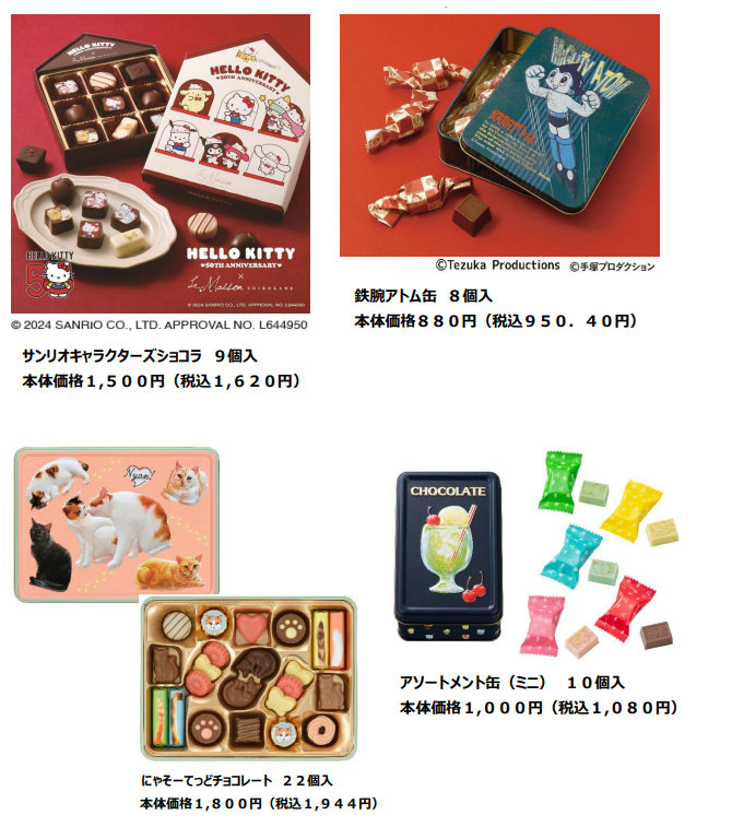 また、おすすめ商品の一例として、ラ・メゾン白金とハローキティ50周年を記念したコラボチョコレートや漫画家手塚治虫の人気キャラクターがレトロかわいくデザインされたチョコレート、付属のシールと推しの写真を組み合わせて箱をデコレーションできるチョコレート、体にやさしいノンシュガーやハイカカオのチョコレートなどを展開している。