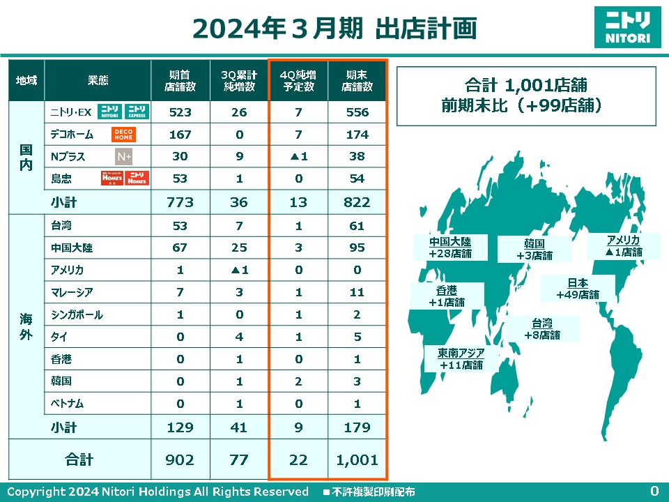 57年⽬の今年3⽉の出店で、国内外のグループ店舗数が1000店舗を達成する。