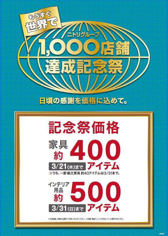 ニトリnews|「もうすぐ世界で、ニトリグループ1000店舗達成記念祭」2/1開催