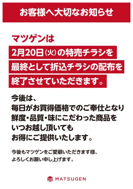 和歌山・大阪・奈良・京都でスーパーマーケット「マツゲン」を展開する松源(和歌山県和歌山市、桑原太郎社長)は2月20日(火)発行の特売チラシを最終として折込チラシの配布を終了する。今後は、毎日がお買得価格でのEDLP展開により、いつ来店してもお得な商品の提供提供を目指す。