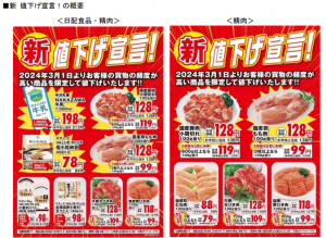 また、3月1日(金)から一部店舗において、精肉と日配食品の対象品を値下げする「新 値下げ宣言!」を実施する。「これ得!値下げ宣言」に加え、顧客の購入頻度の高い肉や食パン・牛乳などの値下げを21店舗(8店舗は精肉限定)で実施する。値下げ率は最大 30%で、精肉は、大パックのご購入で、よりお買い得になる。
