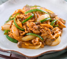 豚肉、ピーマン、玉ねぎをケチャップベースの味わいで炒めた一品。甘みのあるナポリタンのような味わいは子どもにも好評。