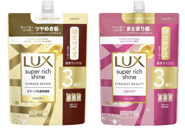 3月から値下げした商品では、「ユニリーバ ラックススーパーリッチシャイン シャンプー 詰替用大容量870g各種」が各768円(税込、以下同)、また、まとめ値引きとして2個買上げで1496円(748/個)になる。
