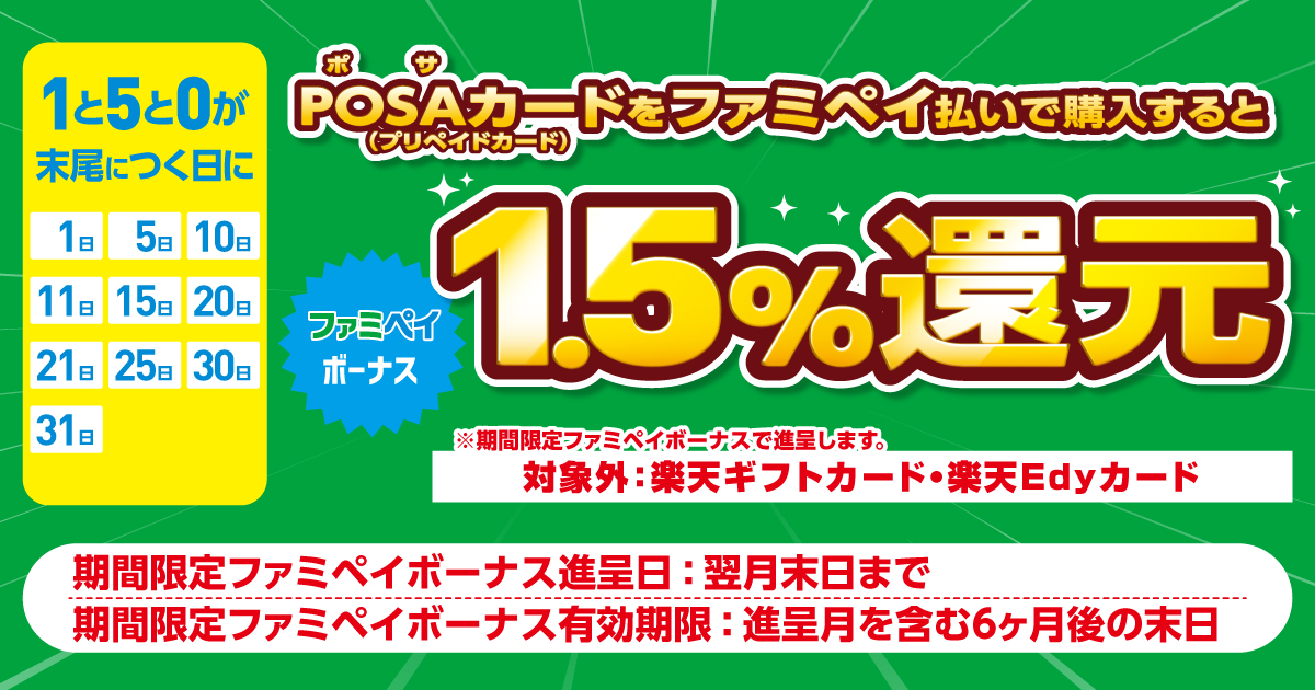 (株)ファミリーマート(東京都港区、細見研介社長)は”1”と”5”と”0”が末尾につく日にファミマのアプリ「ファミペイ」払いでPOSAカードを購入すると、期間限定ファミペイボーナスを1.5%還元するキャンペーンを3月1日(金)から開始した。全国のファミリーマート約1万6300店で実施している。