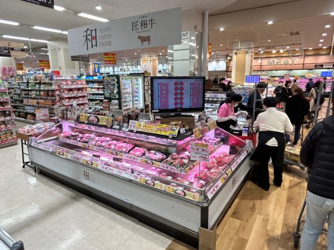 精肉ではトップバリュ匠和牛5等級限定の肩・肩ロースなどの高質アイテムを訴求する。また「おうちで焼肉屋さん」企画として牛タン、シマチョウなど各部位を盛り合わせた焼肉パックを品揃えする。