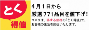 コメリでは、独自の流通網と全国約1200店舗のマス・メリットを活用し、今一番おすすめの商品を値下げする「とく得値」として販売している。4月1日(月)から新たに771品目の商品を値下げした。