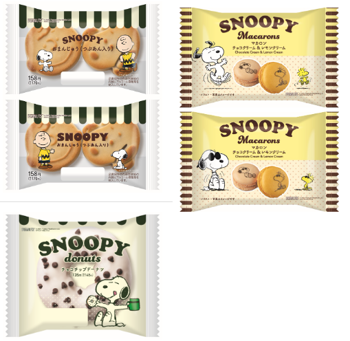 キャンペーンの一つは、コラボレーション商品の発売。商品はおまんじゅう(つぶあん入り)158円(本体価格、以下同)、スヌーピーチョコチップドーナツ135円、マカロンチョコクリーム&レモンクリーム260円。