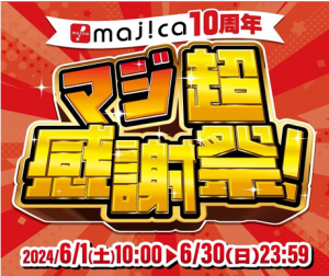 (株)パン・パシフィック・インターナショナルホールディングス(東京都目黒区、吉田直樹社長:PPIH)は 6月1日(土)~6月30日(日)の期間、オリジナル電子マネー「majica(マジカ)」アプリ会員を対象としたキャンペーン「マジ超感謝祭」を実施する。2014年にサービスを開始した「majica」は今年10周年を迎え、会員も1400万人を突破した。