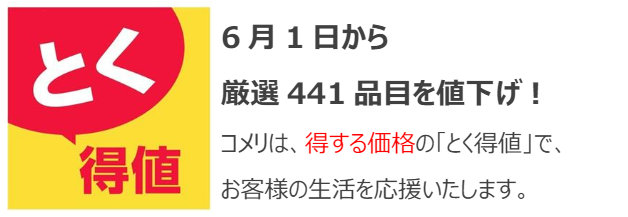 コメリでは、独自の流通網と全国約1200店舗のマス・メリットを活用し、今一番おすすめの商品を値下げする「とく得値」として、厳選した441品目の商品を値下げした。