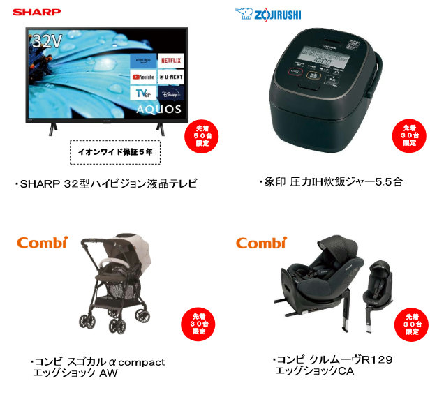 企画の第1は、定額減税額の4万円に合わせて、テレビや炊飯器、ベビーカーやチャイルドシートなど、通常価格合計5万円~6万円の商品を、「4万円均一企画商品」として販売する。「4万円均一企画商品」は、公式オンラインストア「イオン九州オンライン」でも一部商品を販売する。