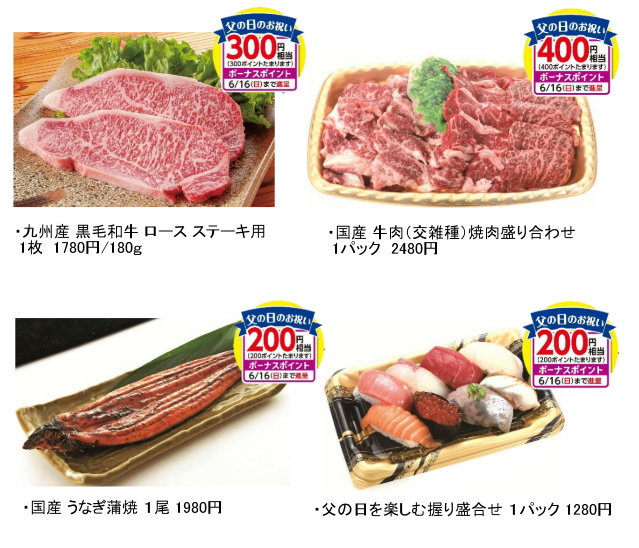第3は、父の日の食卓を彩る肉や魚の“贅沢メニュー”の展開だ。九州産牛ステーキ肉、本鮪中とろ入りの刺身盛合せ、握り寿司、国産のうなぎ蒲焼などのメニューを用意する。また、