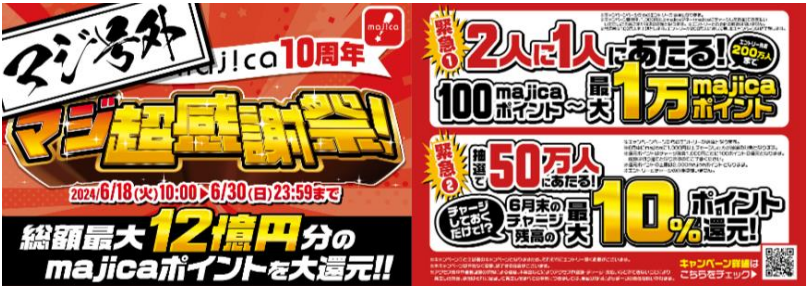 大還元キャンペーンは「2人に1人!100 円~最大1万円分の majica ポイントが当たる」企画と、「50万人に当たる!6月30日時点のチャージ額の10%分をポイント還元!」の2企画。