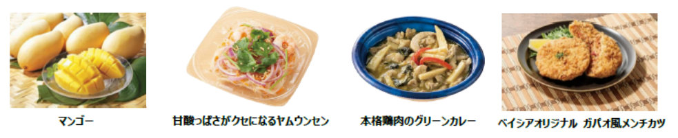 マンゴー 税込価格430円/1個(以下同)、甘酸っぱさがクセになるヤムウンセン 322円/1パック、本格鶏肉のグリーンカレー 421円/1パック、ベイシアオリジナルガパオ風メンチカツ 139円/1個など。