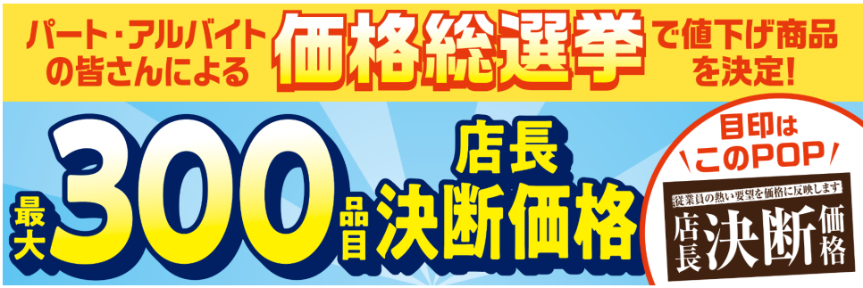 価格総選挙は、日用消耗品を対象に、自身が働く店舗で値下げしてほしいと思う商品最大3点とその希望の価格を投票させた。店舗ごとに選ばれた商品を含む最大300品目は、徹底した競合調査を行って地域最安値を目指す。期間は設けず、対象品目は定期的に更新していく。