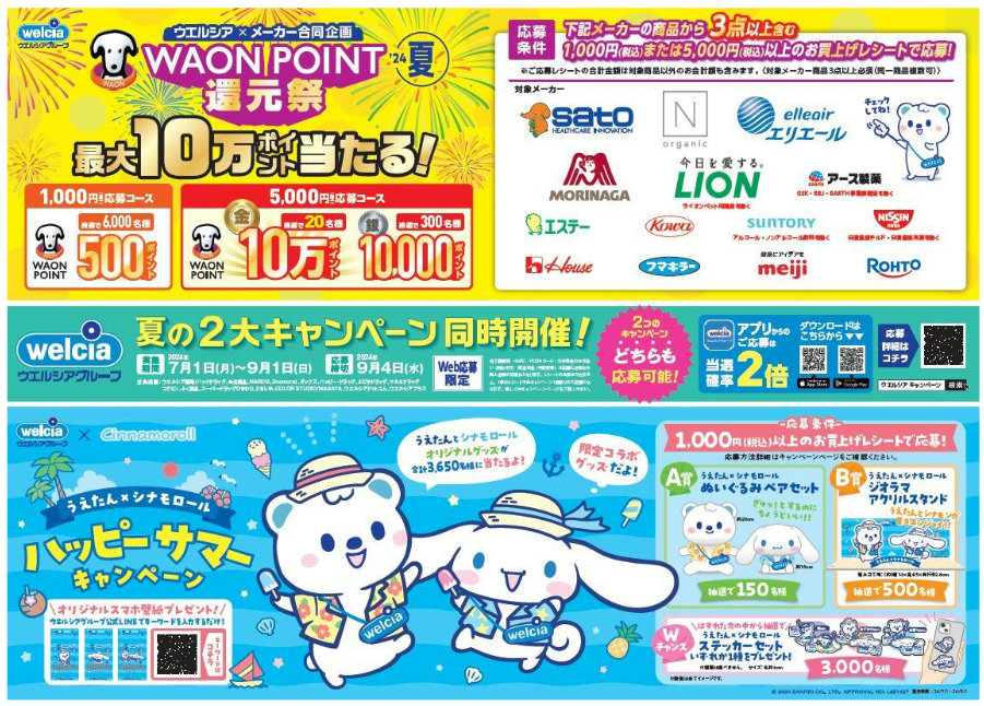 ウエルシアホールディングス(株)(東京都千代田区、桐澤英明社長)は7月1日(月)から、WAON POINTが10万ポイント当たる「ウエルシア×メーカー合同企画WAON POINT 還元祭」と限定コラボグッズが当たる「うえたん×シナモロール ハッピーサマーキャンペーン」の2つのキャンペーンを期間限定で同時開催する。